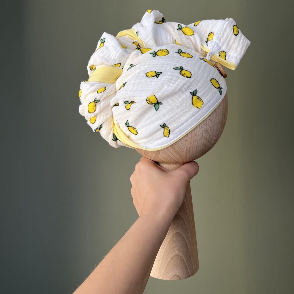 Nasz muślinowy turban do osuszania włosów w cytrynowym wzorze to niezbędny element Twojej pielęgnacji włosów. Połącz funkcjonalność z modą i poczuj różnicę już teraz!